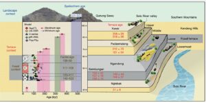 - २. नॅनडाँग येथे सोलो नदीच्या काठावरील मंचके आणि त्यांचे कालमापन दाखविणारे रेखाचित्र – After Rizal et al. 2020