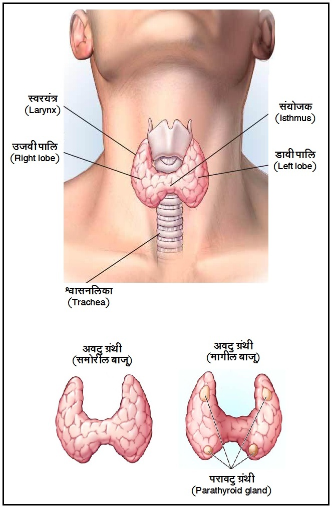 संरचना : अवटु ग्रंथी मानेच्या पुढील भागात स्वरयंत्राच्या (Pharynx) समोर आढळते. प्रौढ व्यक्तीमध्ये अवटु ग्रंथीचे वजन १५ – २५ ग्रॅ. पर्यंत भरते. अवटु ग्रंथी दोन लांबट पालिंपासून (Lobes) बनलेली असते. प्रत्येक पालि २ – २.५ इंच लांब, २ सेंमी. रुंद व २-३ सेंमी. जाडीची असते. या पालि तंतुपुंजात्मक सेतूने (Isthmus) जोडलेल्या असतात. श्वासनलिकेच्या (Trachea) दोन बाजूला दोन पालि असल्याने अवटु ग्रंथी फुलपाखराच्या आकाराची दिसते. पुरुषांच्या तुलनेने स्त्रियांमध्ये अवटु ग्रंथीचा सरासरी आकार मोठा असतो. तसेच गरोदरपणामध्ये अवटु ग्रंथीचा आकार वाढत असल्याचे समोर आले आहे.