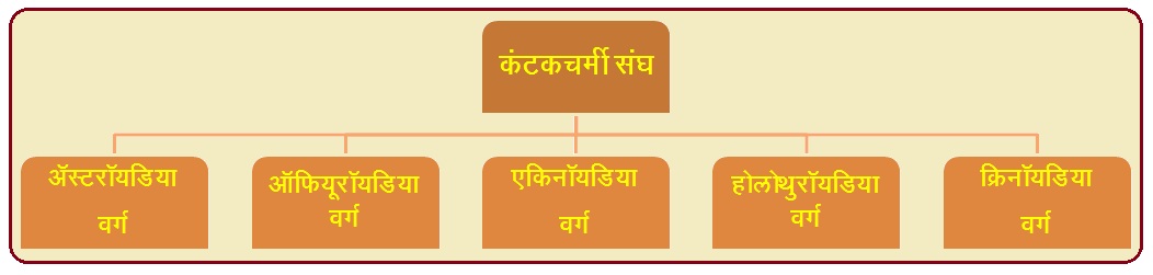 वर्गीकरण : कंटकचर्मी संघाचे वर्गीकरण पुढील पाच वर्गांमध्ये केले आहे : (१) ॲस्टरॉयडिया वर्ग, (२) ऑफियूरॉयडिया वर्ग, (३) एकिनॉयडिया वर्ग, (४) होलोथुरॉयडिया वर्ग आणि (५) क्रिनॉयडिया वर्ग.
