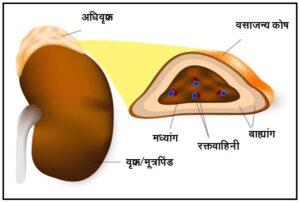 संरचना : मानवी शरीरात अधिवृक्क ग्रंथींची जोडी असते. प्रत्येक मूत्रपिंड/ वृक्काच्या (Kidneys) वरील टोकाला पिवळट रंगाची व त्रिकोणी आकाराची एक अधिवृक्क ग्रंथी आढळते. प्रौढ व्यक्तीमध्ये या ग्रंथीचे वजन ७ – १० ग्रॅम. पर्यंत भरते. प्रत्येक अधिवृक्क ग्रंथी साधारणपणे ५ – ६ सेंमी. लांब, ३ सेंमी. रुंद व १ सेंमी. जाडीची असते. अधिवृक्क ग्रंथी एका वसाजन्य कोशाने (Adipose capsule) वेढलेली असते. हा कोश वृक्क व अधिवृक्क यांचे आघातांपासून संरक्षण करतो.
