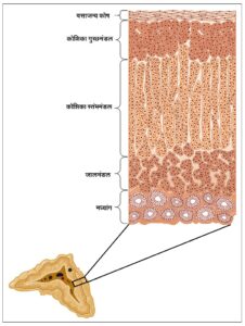 कोशिका-गुच्छमंडलाच्या खालोखाल असलेले कोशिका स्तंभमंडल ग्लुकोकॉर्टिकॉइड (Glucocorticoids) संप्रेरके तयार करते. ग्लुकोकॉर्टिकॉइड संप्रेरके हा कॉर्टिकोस्टेरॉइड संप्रेरकांचा एक उपप्रकार आहे. कर्बोदके, स्निग्धाम्ले व प्रथिने यांच्या मूलभूत चयापचय प्रक्रिया व ऊर्जा निर्मिती करण्याचे अत्यावश्यक काम ही संप्रेरके नियंत्रित करतात. कॉर्टिसॉल/ हायड्रोकॉर्टिसोन (Cortisol / hydrocortisone) हे यांपैकी एक प्रमुख संप्रेरक आहे. मूलभूत चयापचय प्रक्रिया संतुलित ठेवण्यात या संप्रेरकाचा महत्त्वाचा वाटा असतो. मेदाचे विघटन, यकृतामध्ये ग्लुकोज-नवजनन (Gluco-neogenesis), शर्करेचे शोषण यावर ग्लुकोकॉर्टिकोस्टेरॉइड संप्रेरके नियंत्रण राखतात. तसेच क्षार व पाणी यांचा समतोल राखण्यात या संप्रेरकांचा महत्त्वाचा वाटा असतो. प्रतिरक्षण-प्रणाली, समस्थिती, रक्ताभिसरण संस्था यांचे कार्य सुरळीत ठेवण्यास ही संप्रेरके मदत करतात.