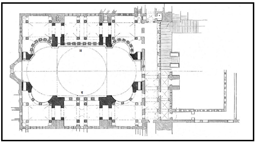 हागिया सोफिया, इस्तंबूल : छज्जाच्या (अ) आणि  तळमजल्याच्या (ब) अर्ध्या भागाचा आराखडा. सौजन्य – विकीमिडीया