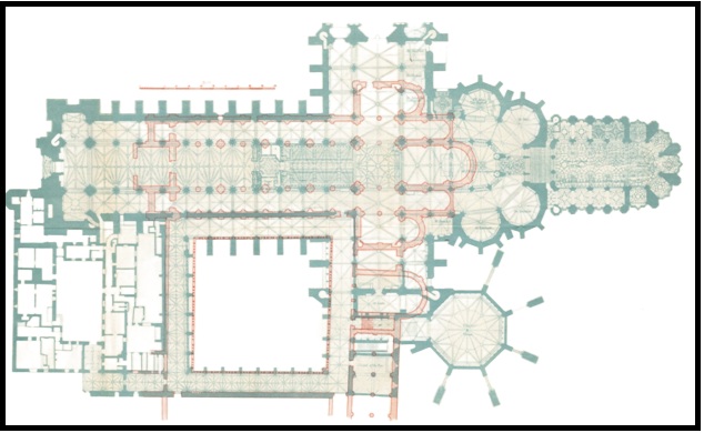 वेस्टमिन्स्टर ॲबी, लंडन : अकराव्या शतकातील चर्च (लाल रंगात) आणि सध्याच्या चर्च (निळ्या रंगात) यांच्या सापेक्षीय स्थानांचा आराखडा. अर्धवर्तुळाकार भिंतीतील अनेक अर्धवर्तुळाकार लहान प्रार्थनाघरे आणि त्यातील सुशोभीकरणाचा आराखडा. सौजन्य – विकीपेडिया.