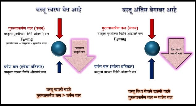 द्रव माध्यमात जेव्हा एखादी वस्तू खाली पडते, तेव्हा तिच्यावर गुरुत्वाकर्षण बल (gravitational force) खालील दिशेने आणि द्रव कर्षण बल वरच्या दिशेने कार्य करते. सुरुवातीला गुरुत्वाकर्षण बल जास्त असल्याने वस्तूचा वेग वाढतो. वेग वाढत गेल्यावर द्रव कर्षण बलही वाढतो. एका विशिष्ट वेळी हे दोन्ही बल परिमाणाने समान होतात. त्या अवस्थेत वस्तूवर लागणारे एकूण बल शून्य होते आणि त्यानंतर वस्तू स्थिर वेगाने खाली पडते.