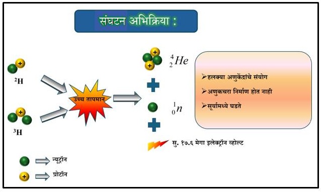 संघटन अभिक्रियेत दोन हलकी अणुकेंद्रे एकत्र येऊन जड अणुकेंद्र तयार करतात आणि त्यातून ऊर्जा मुक्त होते. सूर्य आणि इतर ताऱ्यांमध्ये चालणाऱ्या ऊर्जानिर्मितीचे मूळ हेच संघटन  अभिक्रिया आहे. उदा., दोन हायड्रोजन अणुकेंद्रे एकत्र येऊन हीलियम अणुकेंद्र तयार करतात आणि त्यातून प्रचंड ऊर्जा उत्सर्जित होते. या प्रक्रियेमुळे सूर्य दीर्घकाळ स्थिर ऊर्जा देऊ शकतो.