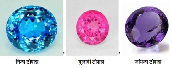 रंगहीन टोपॅझ मुबलक प्रमाणात आढळतो आणि त्याला निळा रंग देण्यासाठी अनेकदा त्यावर प्रक्रिया केली जाते. निळ्या टोपॅझला लंडन ब्लू टोपॅझ, स्विस ब्लू टोपॅझ, इम्पिरियल टोपॅझ किंवा स्काय ब्लू टोपॅझ अशी नावे आहेत.